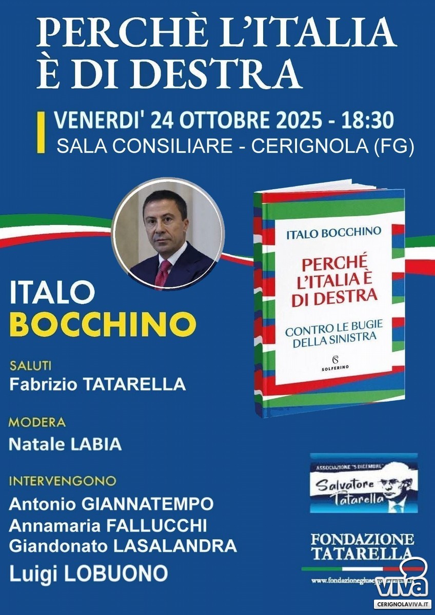 Venerdì 24 ottobre a Cerignola (Fg) alle 18.30 nella sala Consiliare di Palazzo di città, la Fondazione Tatarella e l'Associazione "5 dicembre - Salvatore Tatarella" ospitano Italo Bocchino, direttore editoriale del 'Secolo d'Italia' per presentare il suo libro 'Perché l'Italia è di destra. Contro le bugie della sinistra'.