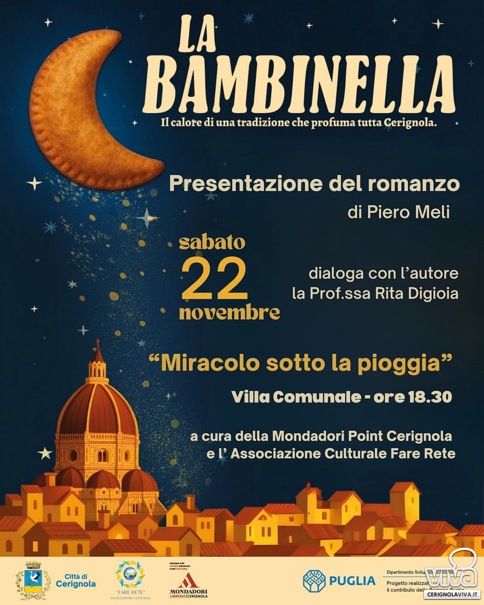 Piero Meli sarà a Cerignola per presentare il suo ultimo libro, intitolato "Piccoli miracoli sotto la pioggia" (Giulio Perrone editore). L'iniziativa, promossa da Mondadori Point e Associazione culturale Fare Rete, si svolgerà con il patrocinio del Comune di Cerignola, nell'ambito del programma "Bambinella a Cerignola". L'autore pugliese incontrerà il pubblico di lettori in Villa Comunale sabato 22 Novembre, alle ore 18.30.