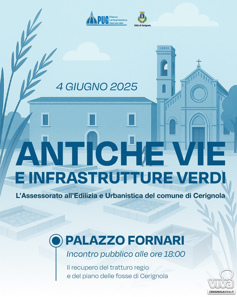 Mercoledì 4 giugno, a Palazzo Fornari alle ore 18:00, è in programma un incontro pubblico organizzato dall'Assessorato all'Urbanistica del Comune di Cerignola dal titolo "Antiche vie e infrastrutture verdi".