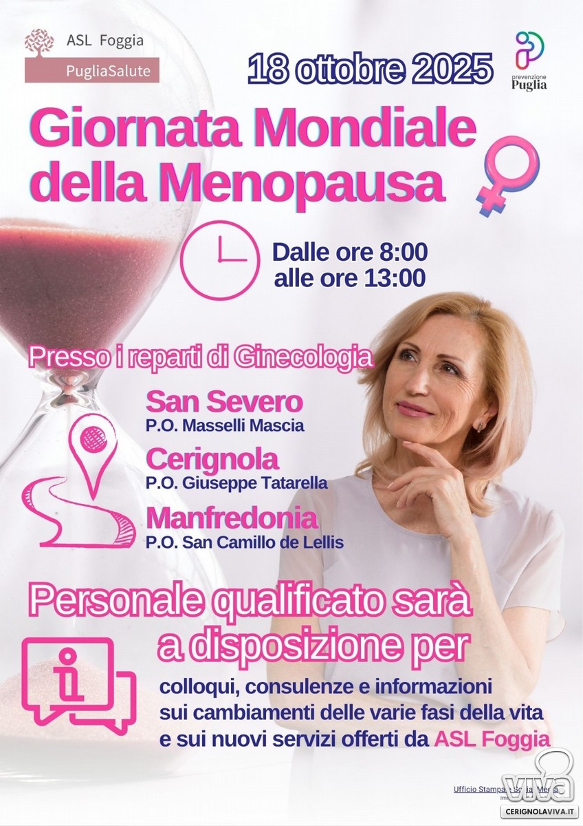 In occasione della Giornata Mondiale della Menopausa, ASL Foggia organizza, venerdì 18 ottobre, un Open Day dedicato alle donne, con l'obiettivo di accrescere la consapevolezza sui cambiamenti fisiologici che accompagnano questa fase della vita e promuovere comportamenti, percorsi diagnostici e strategie terapeutiche volte a tutelare e migliorare la salute femminile.
