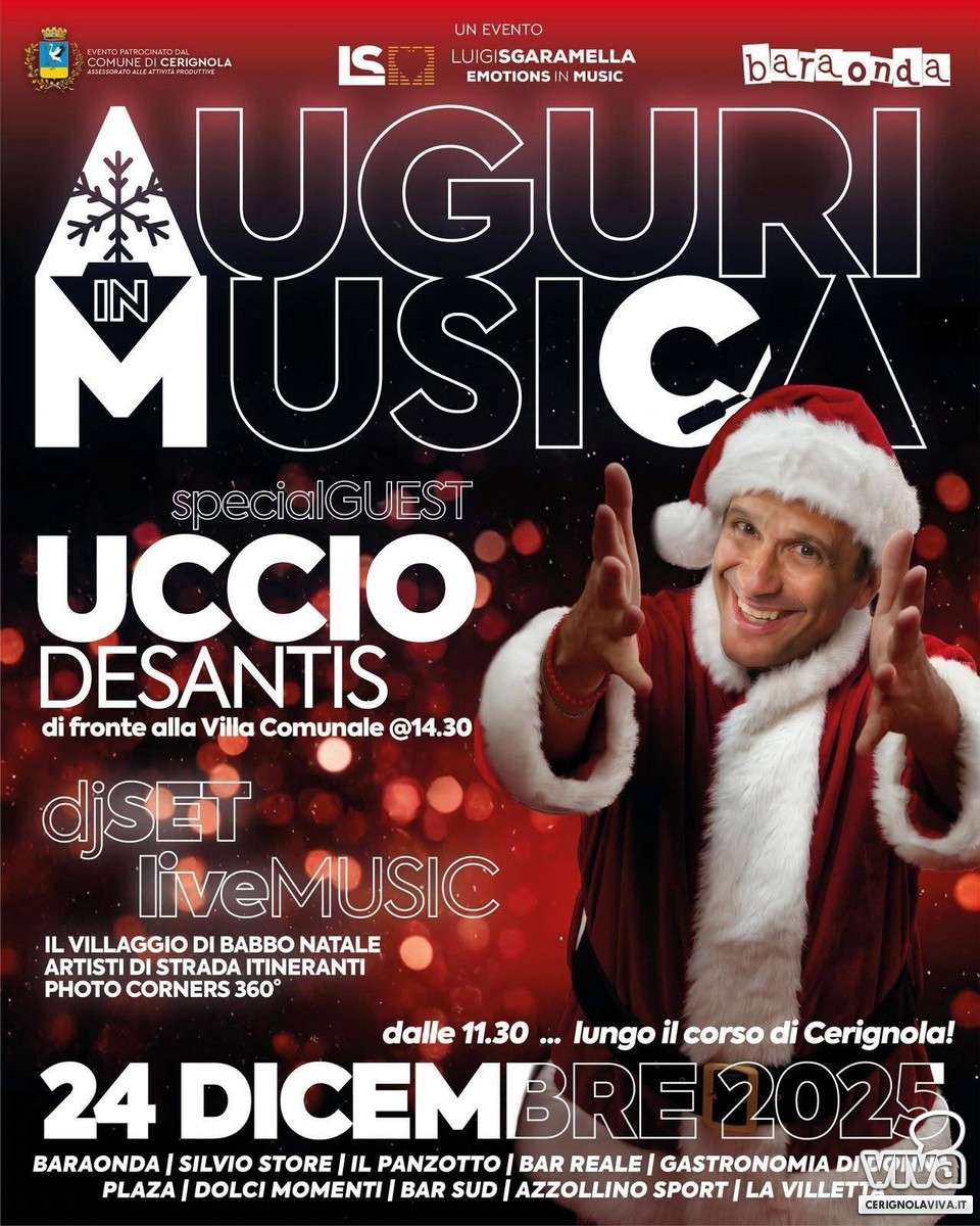 Dopo la Notte Fantastica di sabato scorso, il programma degli eventi natalizi a Cerignola prosegue con altri due eventi clou da non perdere. Il 24 dicembre torna l'appuntamento tradizionale che trasforma il corso cittadino in un salotto urbano tra musica diffusa. Quest'anno è prevista un'iniezione di risate di fama nazionale con Uccio De Santis, che si esibirà alle ore 14.30 di fronte alla Villa comunale.