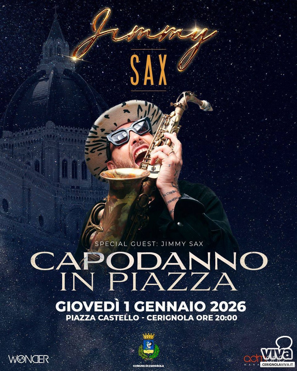 Il nuovo anno a Cerignola si aprirà con il "botto": il 1° Gennaio si esibirà Jimmy Sax in una cornice inedita, Piazza Castello. Il concerto avrà inizio alle ore 20 con Pippo Pelo & Adriana dal Pippo Pelo Show – di Radio Kiss Kiss.