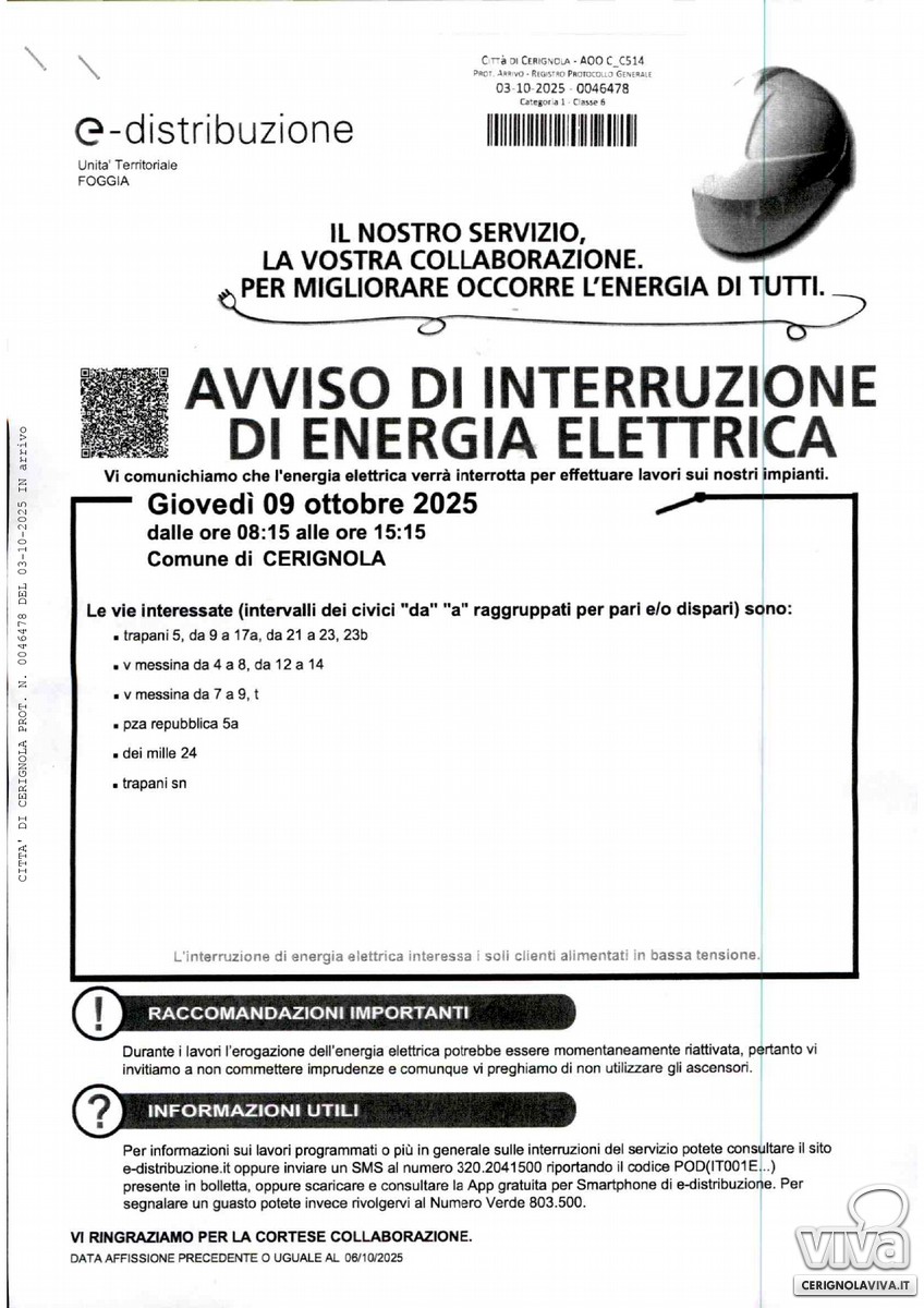 Il Comune di Cerignola ha diffuso un annuncio ai cittadini, in particolare a quelli residenti nelle seguenti vie: via Trapani (numeri civici: 5, da 9 a 17A, da 21 a 23, 23b), via Messina (numeri civici: da 4 a 8, da 8 a 14, da 7 a 9), Piazza della Repubblica (numero civico 5a), Via dei Mille (numero civico: 24), Via Trapani sn.