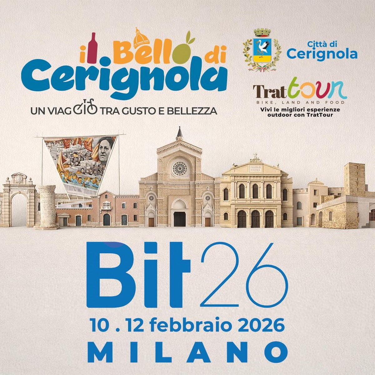 Giovedì 12 febbraio, intorno alle ore 16:00, il Comune di Cerignola e l'associazione Trattour Aps saranno presenti alla BIT – Borsa Internazionale del Turismo (Fiera Milano Rho), all'interno dello stand della Regione Puglia (Padiglione 11 – Sala conferenze), per raccontare e condividere il progetto "Il Bello di Cerignola - un viaggio tra gusto e bellezza".