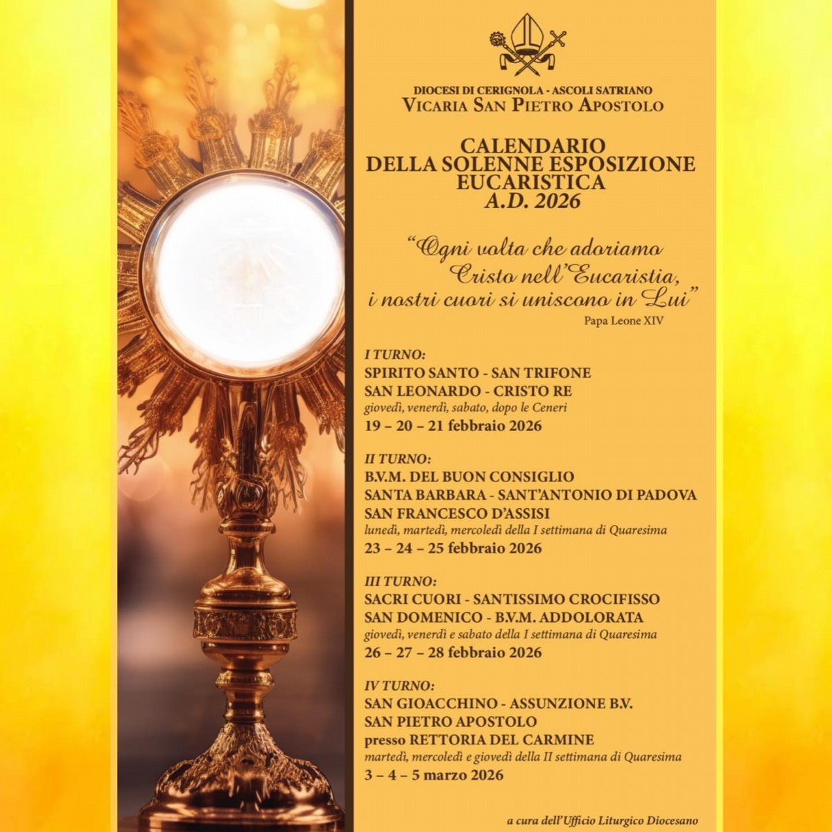 La Diocesi di Cerignola – Ascoli Satriano, attraverso la Vicaria San Pietro Apostolo, ha pubblicato il Calendario della Solenne Esposizione Eucaristica A.D. 2026, un appuntamento spirituale che accompagnerà i fedeli nel tempo di Quaresima.