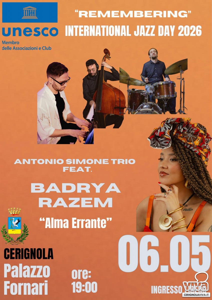 Un viaggio musicale tra jazz, canzone d'autore e sonorità mediterranee. Il trio guidato da Antonio Simone incontra la voce intensa e raffinata di Badrya Razem, artista italo-algerina, dando vita ad un dialogo sonoro che attraversa culture e linguaggi. Si ringrazia l'Assessore Maria Dibisceglia per il patrocino con la concessione di Palazzo Fornari.