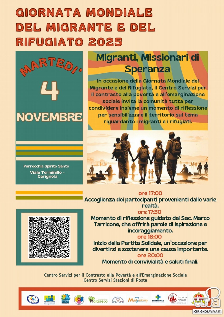 Un momento di riflessione e di socializzazione per sensibilizzare il territorio sul tema riguardante i migranti e i rifugiati che vivono nelle nostre comunità. È il senso dell'iniziativa "Migranti, Missionari di speranza" in programma domani, martedì 4 novembre 2025 a Cerignola, in occasione della "Giornata Mondiale del Migrante e del Rifugiato", che dal 1914 offre l'opportunità di esprimere vicinanza e solidarietà a tutte quelle persone che, per molteplici ragioni, sono costrette a spostarsi e a vivere in condizioni di vulnerabilità.