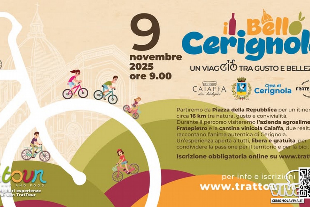 E' un viaggio tra gusto e bellezza quello proposto dall'associazione Trattour APS-FIAB di Cerignola, che si svolgerà domenica 9 Novembre dalle ore 8:30 alle 13.00. "Il Bello di Cerignola" è un tour gratuito e aperto a chiunque desideri condividere la passione per la nostra terra.