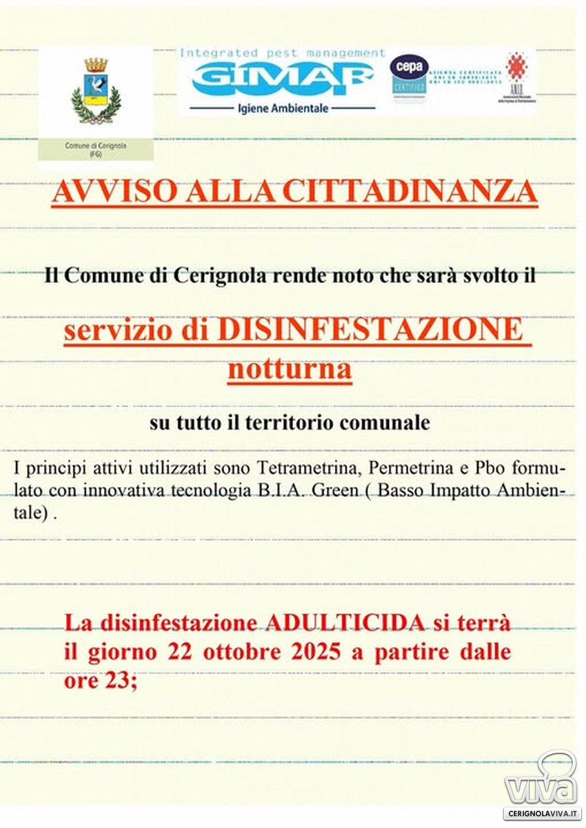 Dalle ore 23:00 di domani mercoledì 22 Ottobre verrà effettuato un servizio di disinfestazione in tutto il territorio comunale.