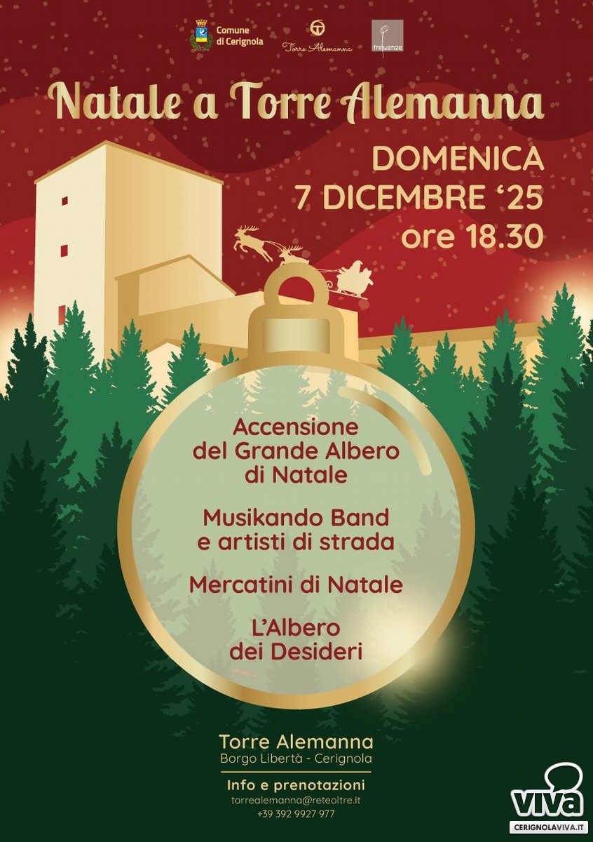 Il 7 dicembre, a partire dalle 18:30, parte il calendario di eventi natalizi presso Torre Alemanna a Borgo Libertà, con la suggestiva accensione del grande albero di Natale.