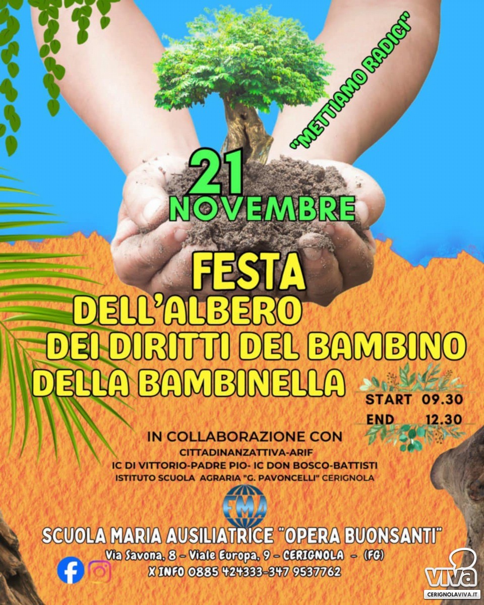 Venerdì 21 Novembre, in occasione della Giornata Nazionale dell'Albero, presso la Scuola Paritaria dell'Infanzia e Primaria "Opera Buonsanti" delle Figlie di Maria Ausiliatrice, sita in Via Savona 8 a Cerignola, si terrà l'VIII edizione della Festa dell'albero, dei diritti del bambino e della Bambinella, evento profondamente sentito dalla comunità cerignolana.