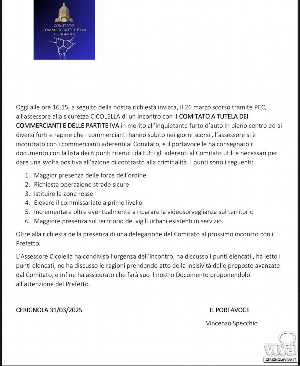 «Dopo che il Comitato A Tutela Dei Commercianti E Partite Iva Di Cerignola ha dato la notizia degli avvenuti furti ai danni delle boutique Calliope e Brenvaldi su corso Roma, oggi, e solo oggi, l'Assessore comunale alla sicurezza esterna in un video comunicato la sua solidarietà agli esercenti coinvolti, e si rammarica dello stato pietoso in cui versa la sicurezza pubblica a Cerignola, e avverte che quanto prima andrà dal Prefetto per chiedere la misura detta "Strade sicure", in sintesi: la presenza dell'Esercito in Città», dichiara il portavoce Vincenzo Specchio.