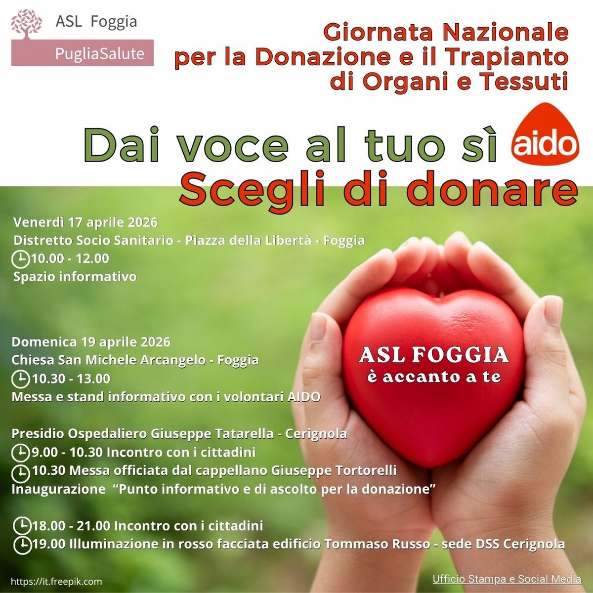ASL Foggia, in vista della Giornata Nazionale per la Donazione e il Trapianto di Organi e Tessuti che si celebra il 19 aprile 2026, promuove iniziative di informazione e sensibilizzazione sull'importanza di compiere una scelta libera e solidale, in linea con la campagna promossa dal Ministero della Salute.