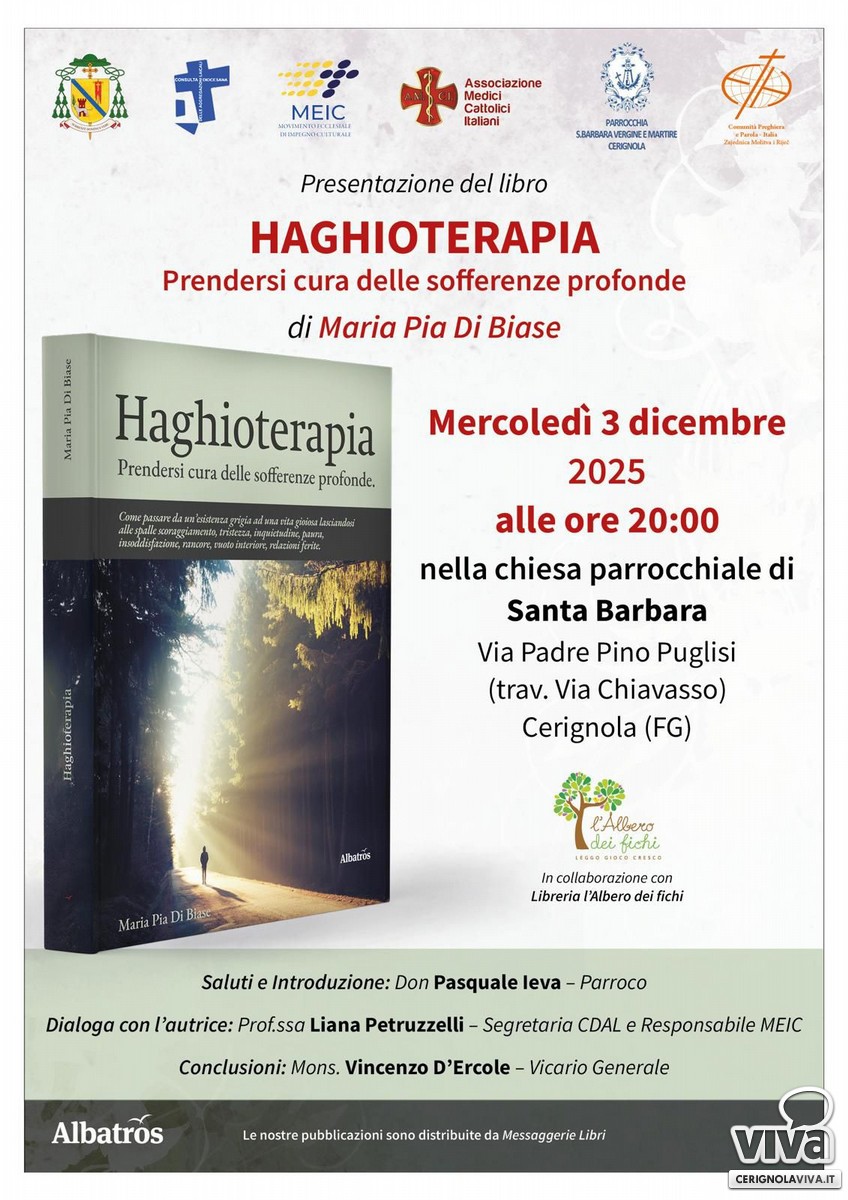 Mercoledì 3 dicembre alle ore 20 presso la Chiesa di Santa Barbara a Cerignola è previsto un appuntamento speciale che unisce spiritualità, ricerca interiore e cura dell'anima. Si terrà la presentazione del libro: "HAGHIOTERAPIA"- prendersi cura delle sofferenze profonde" dell'autrice Maria Pia Di Biase (edizioni Albatros).