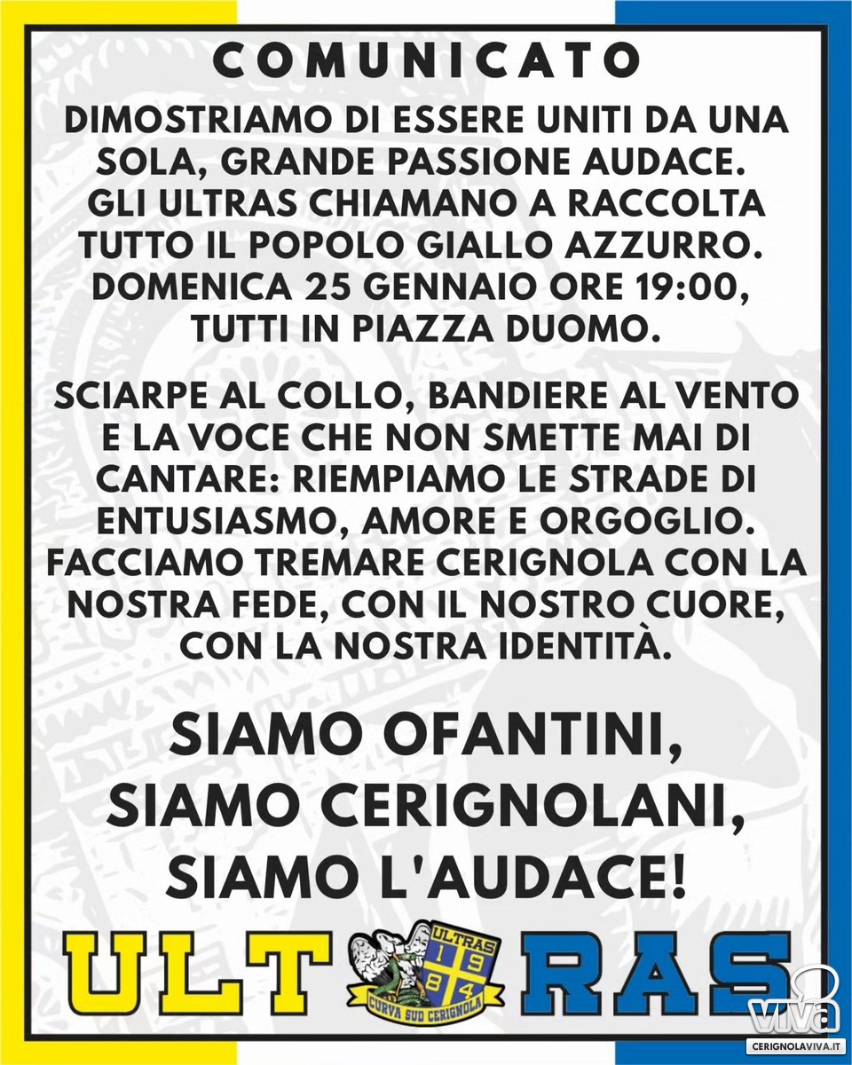 "Dimostriamo di essere uniti da una sola, grande PASSIONE AUDACE: gli Ultras chiamano a raccolta tutto il popolo giallo azzurro. Domenica 25 Gennaio ore 19:00, tutti in Piazza Duomo.