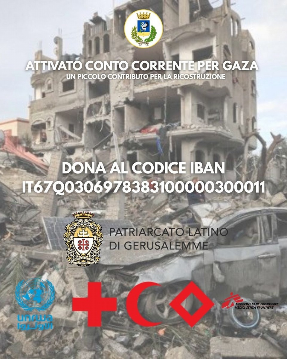 L'amministrazione comunale di Cerignola ricorda alla cittadinanza che ha attivato un conto corrente per la raccolta di fondi a sostegno di misure di solidarietà nei confronti della popolazione di Gaza. Una volta terminata la raccolta dei fondi, si provvederà ad aprire un canale diretto con il patriarca di Gerusalemme, il cardinale Pierbattista Pizzaballa, per la gestione in loco delle risorse economiche.