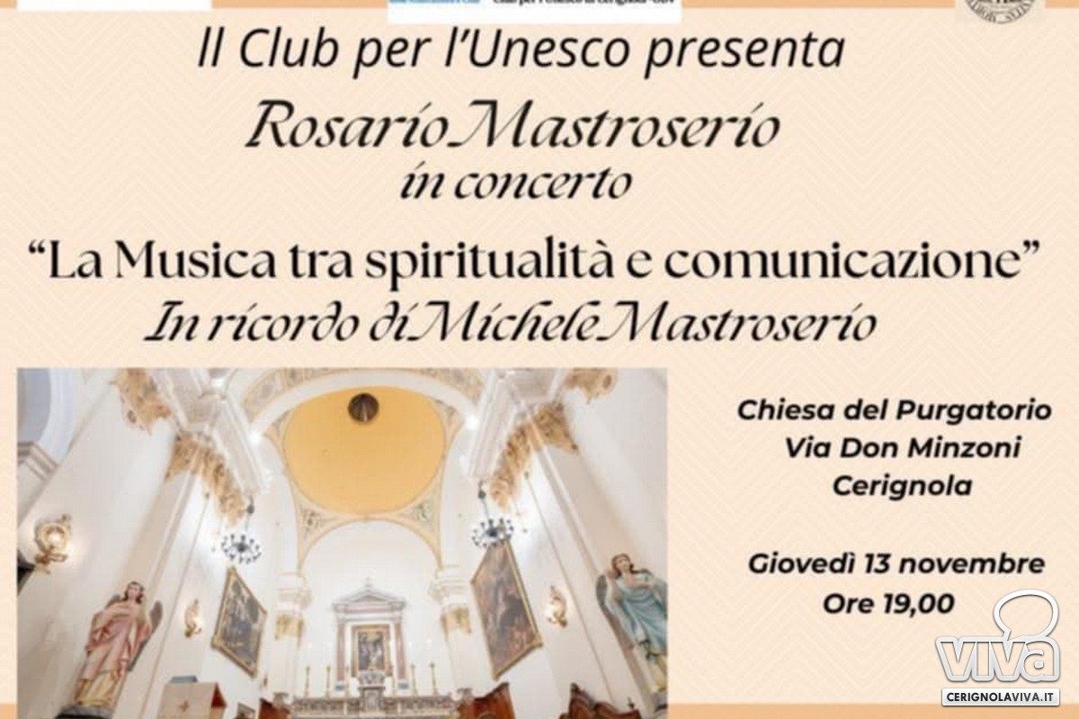 All'interno della Chiesa del Purgatorio, scrigno di memoria storica della nostra città, il Club per l'Unesco di Cerignola in collaborazione con la Diocesi e l'Arciconfraternita della Morte, presenta un evento musicale di grande rilevanza. Il Maestro Rosario Mastroserio terrà un concerto in ricordo del fratello Michele.
