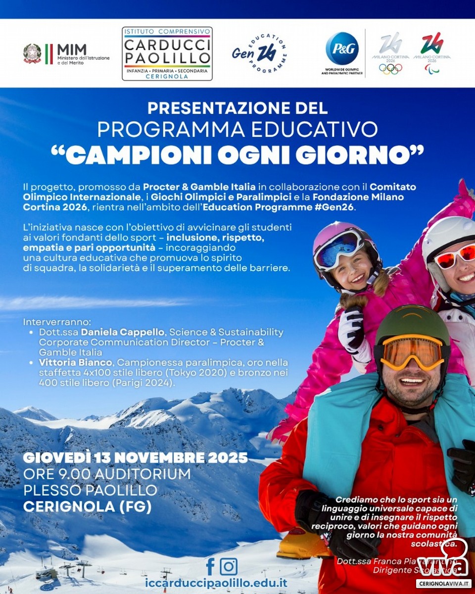 L'Istituto Comprensivo Carducci–Paolillo di Cerignola è orgoglioso di annunciare l'arrivo del programma educativo "Campioni Ogni Giorno", promosso da Procter & Gamble Italia in collaborazione con il Comitato Olimpico Internazionale, i Giochi Olimpici e Paralimpici e la Fondazione Milano Cortina 2026, nell'ambito dell'Education Programme #Gen26.