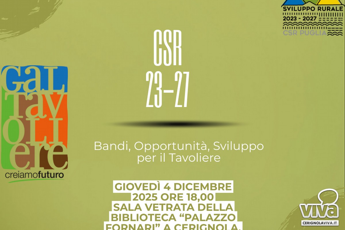 Il GAL Tavoliere invita cittadini, enti locali, operatori economici e rappresentanti del terzo settore a partecipare all'incontro pubblico dedicato alla presentazione della Strategia di Sviluppo Locale (SSL) per il CSR 2023–2027, in programma giovedì 4 dicembre 2025 alle ore 18:00, presso la Sala Vetrata della Biblioteca "Palazzo Fornari" a Cerignola.