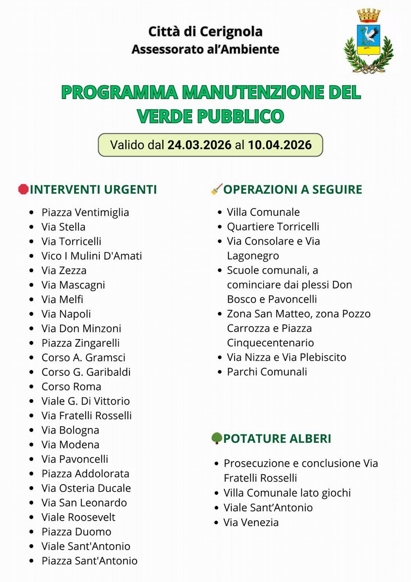 Continua senza sosta l'impegno per una città più decorosa e vivibile. È online il nuovo programma di manutenzione del verde pubblico comprensiva della manutenzione degli alberi valido dal 24 marzo al 10 aprile 2026.