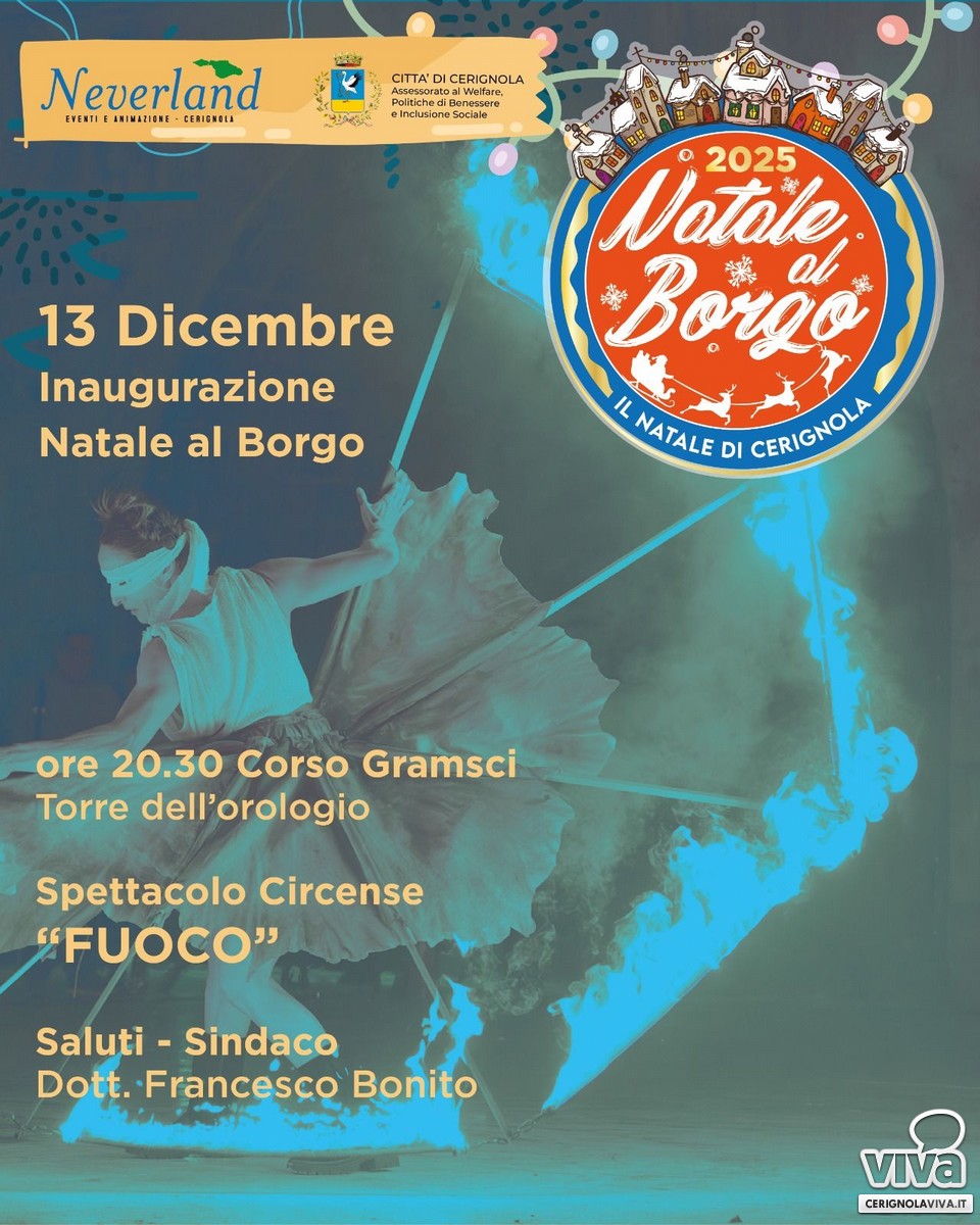 Prenderà avvio domani, sabato 13 dicembre, l'iniziativa "Natale al Borgo" a Cerignola a cura dell'associazione "Neverland", con l'obiettivo di valorizzare il territorio, promuovere un'immagine riconoscibile della Terra Vecchia e rafforzare il legame dei cittadini con la propria storia e tradizione.