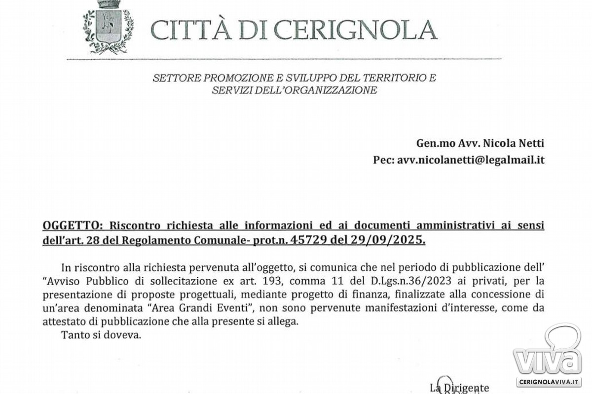 "Le carte parlano! Come per il nuovo stadio, Piazza Duomo, zona pedonale e monumento al vocabolario Zingarelli, anche sull'area "Grandi Eventi" l'amministrazione Bonito-Cicolella dimostra di essere il bluff politico più grande della storia cerignolana. Il nulla, misto a proclami, conditi con il nulla più assoluto", dichiara Nicola Netti, consigliere del gruppo politico "Fratelli d'Italia", a corredo della comunicazione pervenuta in cui appunto si fa presente che nessuna manifestazione di interesse da parte di privati è giunta a seguito della pubblicazione dell'avviso pubblico circa l'Area Grandi Eventi.