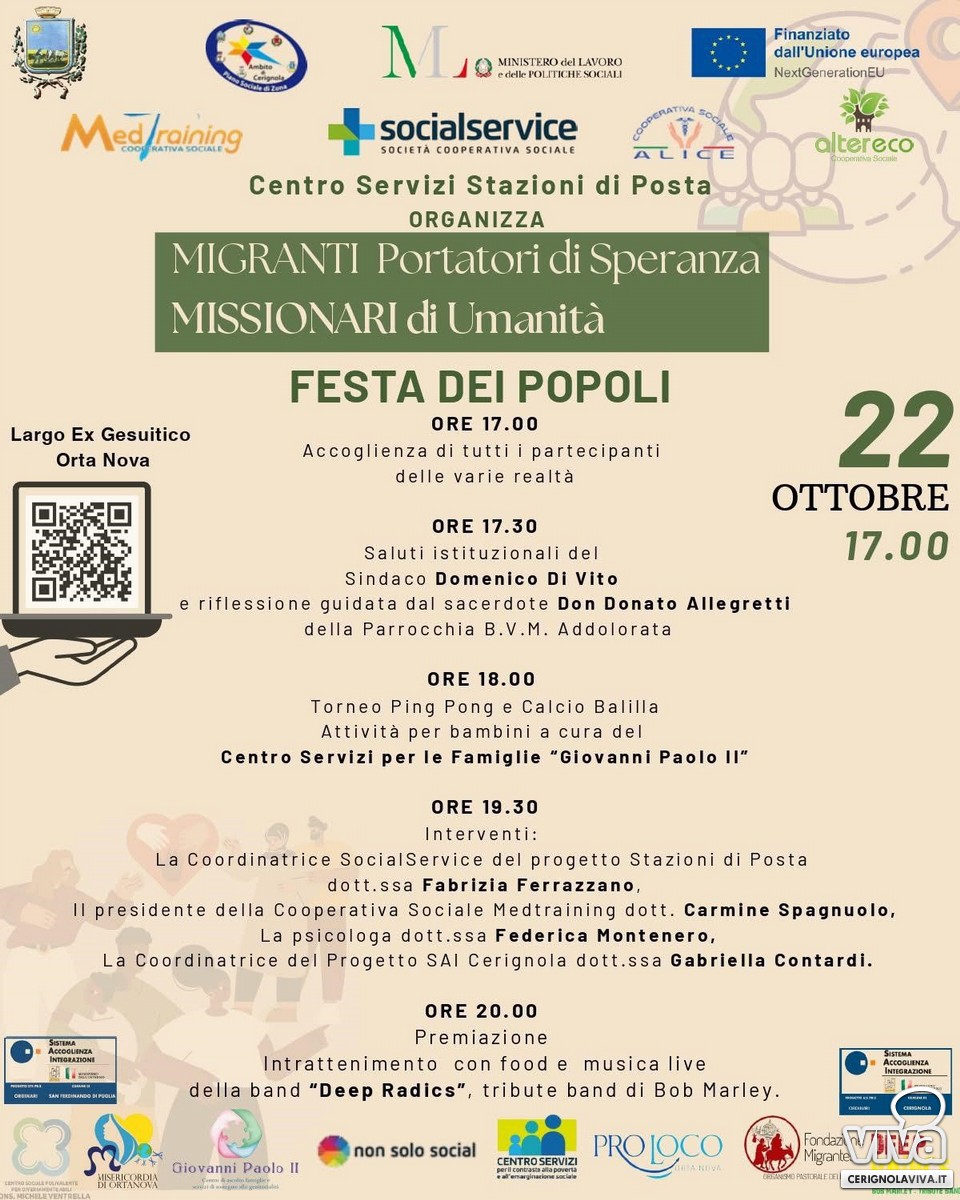 Il Centro Servizi Stazioni di Posta attivo nell'Ambito Territoriale di Cerignola ha quindi organizzato un evento che a partire dalle ore 17.00 animerà Largo Ex Gesuitico con l'accoglienza di tutti i partecipanti delle varie realtà coinvolte, tra cui beneficiari e beneficiarie dei progetti Sai – Sistema di Accoglienza e Integrazione di San Ferdinando di Puglia e Cerignola ampliamento.