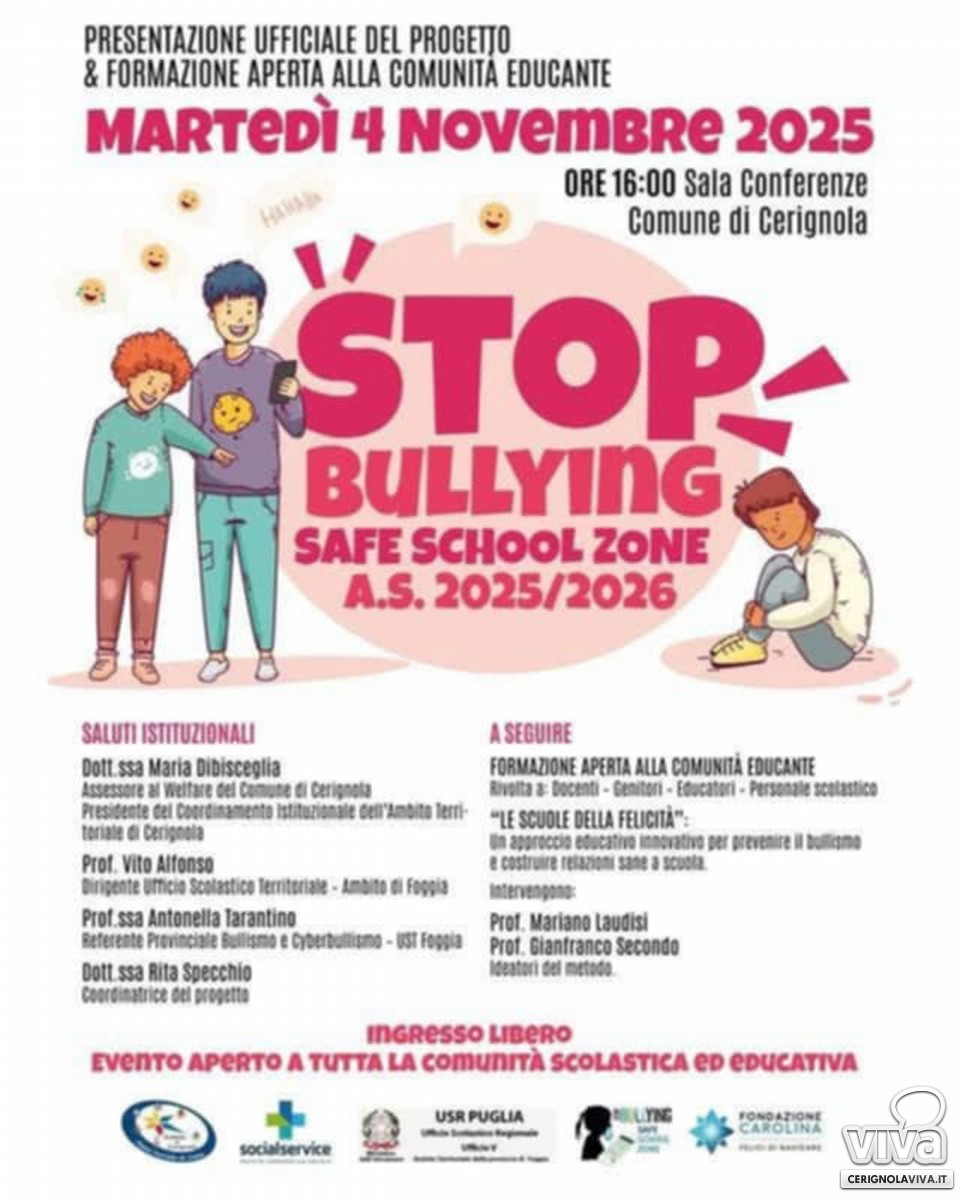 Martedì 4 Novembre alle ore 16 presso la Sala Conferenze del Comune di Cerignola si svolgerà la presentazione ufficiale del progetto e formazione aperta alla comunità educante "Stop Bullying Safe School Zone A.S. 2025/26"