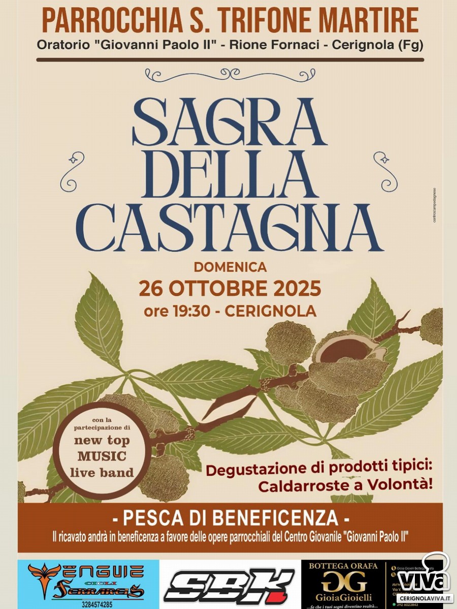 E' diventato ormai un appuntamento fisso che caratterizza il periodo autunnale a Cerignola. Come tutte le sagre che si rispettino, anche la Sagra della Castagna edizione 2025, promossa e organizzata dalla Parrocchia San Trifone Martire nel Rione Fornaci, si svolgerà rigorosamente all'aperto, negli spazi dell'oratorio "Giovanni Paolo II".