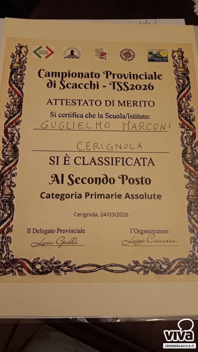 Una grande soddisfazione per i giovani scacchisti del Circolo Didattico "Guglielmo Marconi" di Cerignola, protagonisti ieri al Liceo Scientifico "A. Einstein" di Cerignola per la fase provinciale del torneo di scacchi dedicato alle Scuole Primarie e Secondarie.