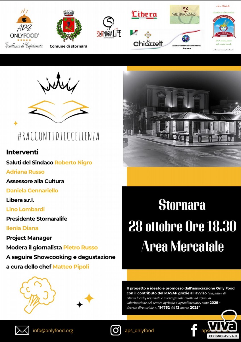 L'associazione Only Food, in collaborazione con il Comune di Stornara e con il contributo del MASAF, ha infatti organizzato un talk ed una degustazione di pietanze a base di broccoli, a cura dello chef Matteo Pipoli, nell'area Mercatale di Stornara sabato 28 Ottobre alle ore 18.30